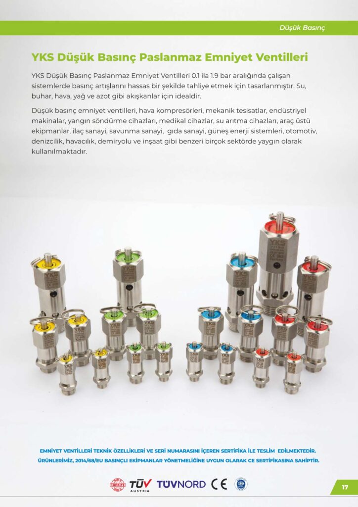 YKS Emniyet Ventilleri, ekipmanların verimli ve uzun ömürlü çalışabilmesi için en kritik unsurlardan biridir. YKS Düşük Basınç Emniyet Ventilleri, 0.1 ila 1.9 bar aralığında çalışan sistemlerde oluşabilecek basınç artışlarını hassas, hızlı ve güvenli bir şekilde tahliye etmek üzere tasarlanmıştır. Su, buhar, hava, yağ ve azot gibi birçok akışkan için ideal yapısıyla sektör genelinde yaygın olarak tercih edilmektedir. YKS Emniyet Ventilleri başlıca olarak Hava kompresörleri, basınçlı tanklar, mekanik tesisatlar, azot jeneratörleri, buhar jeneratörleri, endüstriyel makinalar, yangın söndürme sistemleri, yangın pompaları, medikal ve starilizasyon cihazları, arıtma sistemleri, araç üstü ekipmanlar, iş makinaları, raylı ulaşım araçları, ilaç sanayi, kozmetik sanayi, savunma sanayi, gıda sanayi, güneş enerji sistemleri, maden, petrol, endüstri, otomotiv, denizcilik, havacılık, demiryolu, inşaat gibi birçok benzeri sektörde yaygın olarak kullanılmaktadır.
